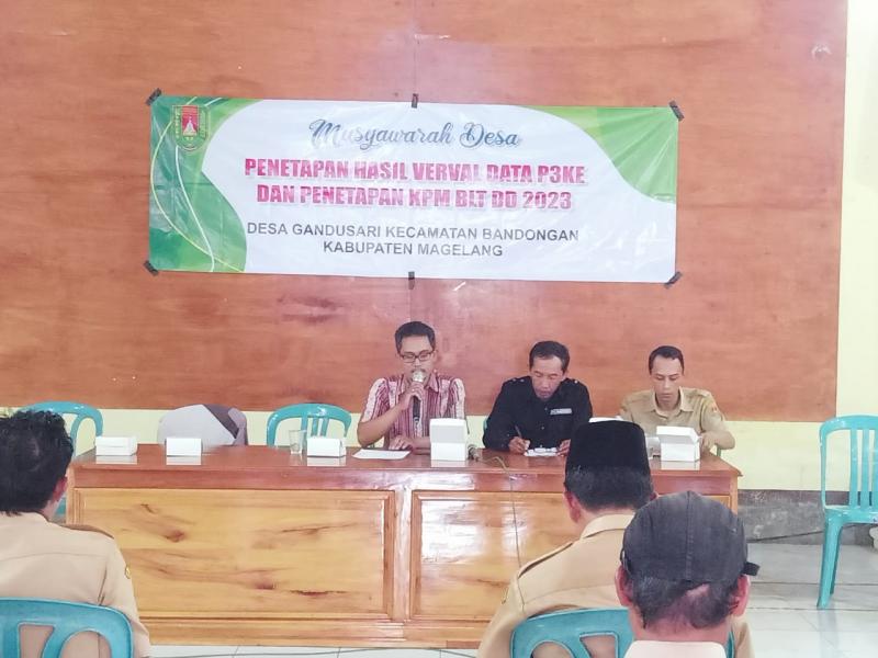 Di waktu berbeda, juga diadakan Musdes penetapan hasil Verval data P3KE dan penetapan KPM BLT Dana Desa sesuai amanat Peraturan Menteri Keuangan tentang dana desa 2023.